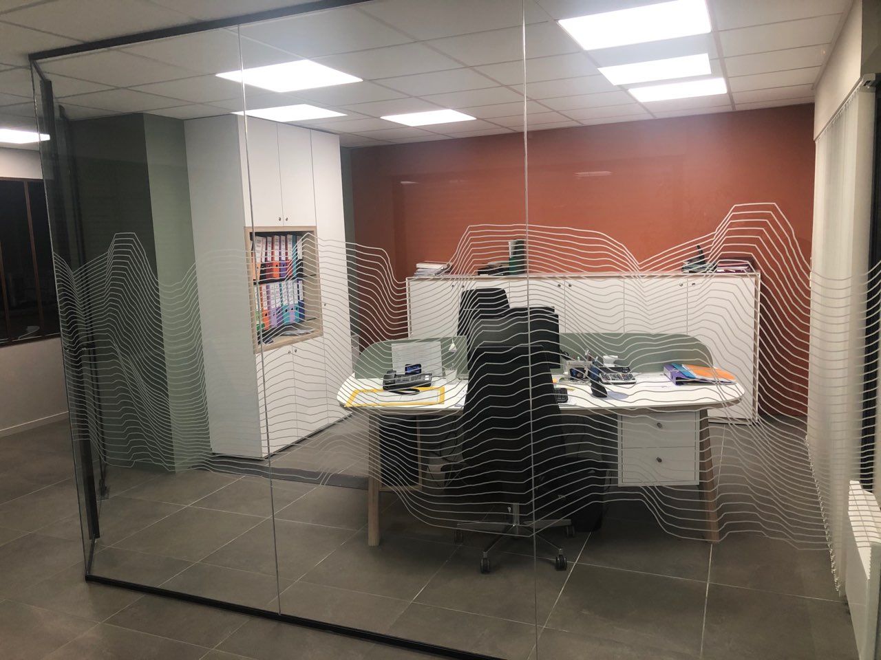 Le client voulait conserver la vision sur la porte d’entrée tout en fermant l’espace pour plus de confort pour les salariés. J’ai donc imaginé une cloison en verre de style contemporain, avec un marquage sérigraphié pour plus d’intimité.